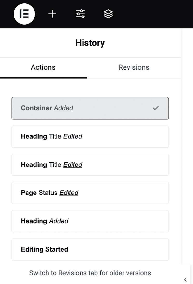 Elementor gives you two tabs: Actions and Revisions. Actions are the recent changes on your page, while revisions are the older versions.