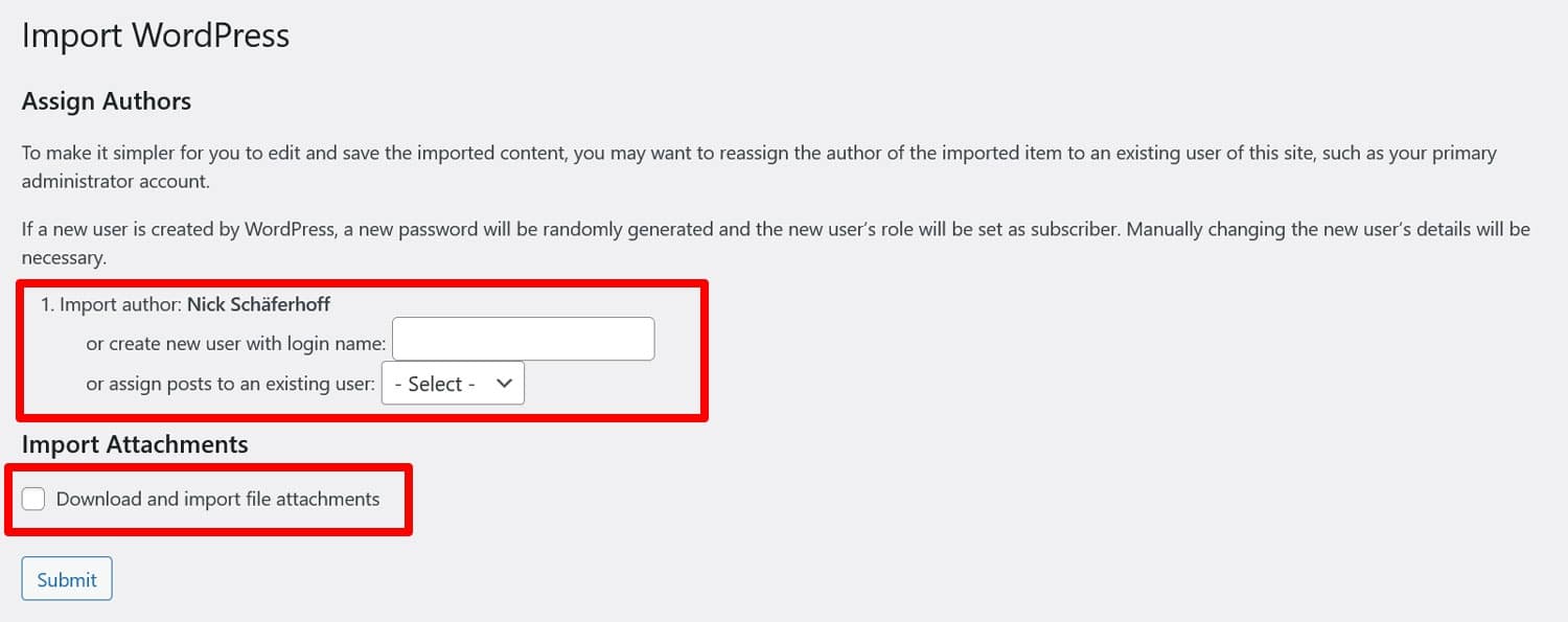 Tick the checkbox where it says Download and import file attachments. It will import your blog posts’ featured images. We’ll talk about how to import other images below.