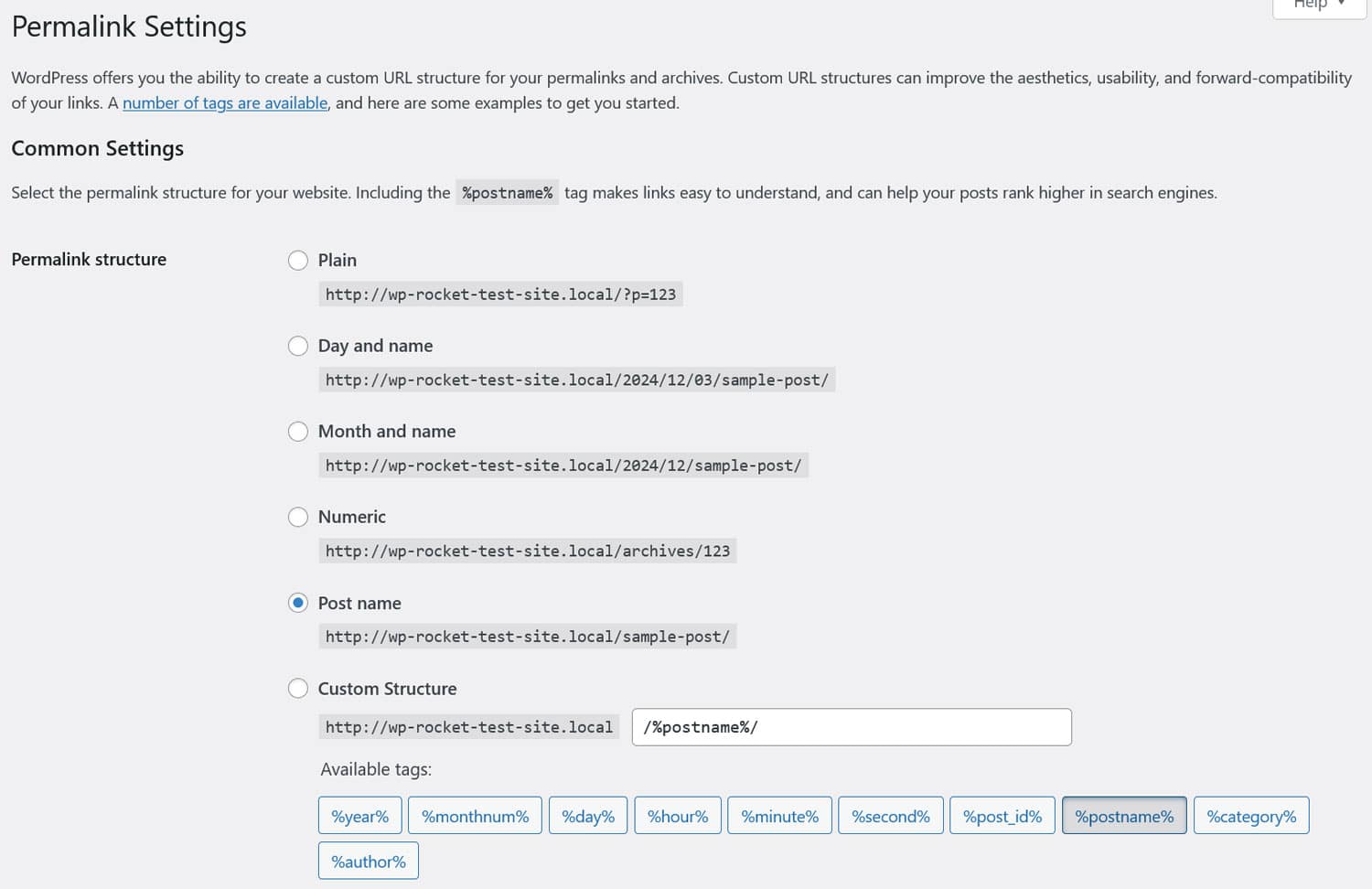 Here, you can configure your overall URL structure. The most common choice is simply Post name but you can also create a custom structure, for example, to recreate your existing Squarespace permalinks.