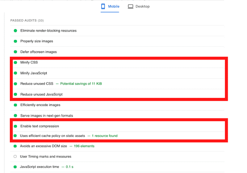 As seen in the first section of this article, my grade on mobile was 84/100 with a few performance issues flagged by PSI: