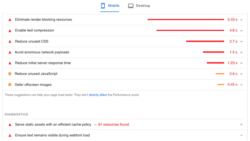 Finally, PSI also flags other performance issues related to CSS, JS, caching, fonts optimization and lazy loading. Those are the metrics we presented in the previous section to fix the warning of the enormous network payloads.