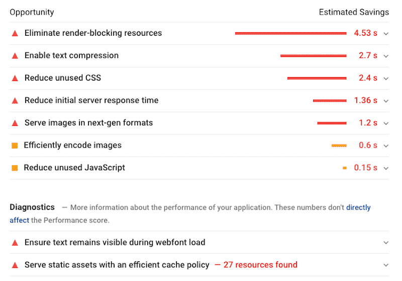 The majority of my KPI s are in orange and red. When you scroll down the report’s page, we see that Lighthouse has flagged some issues: