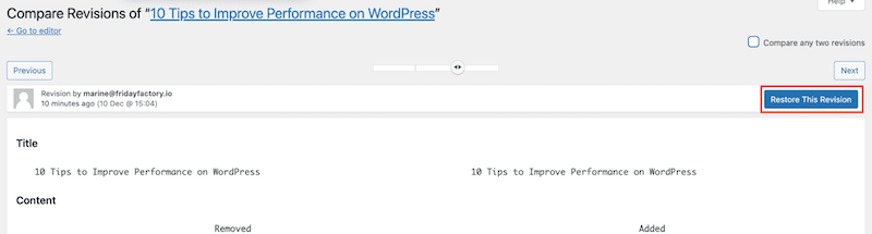 Another interesting feature is comparing an older version with a more recent one. To do so, check the Compare any two revisions box and select the dates you want to compare.