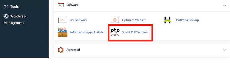 2. Then scroll to the Software submenu and click the Select PHP Version button.