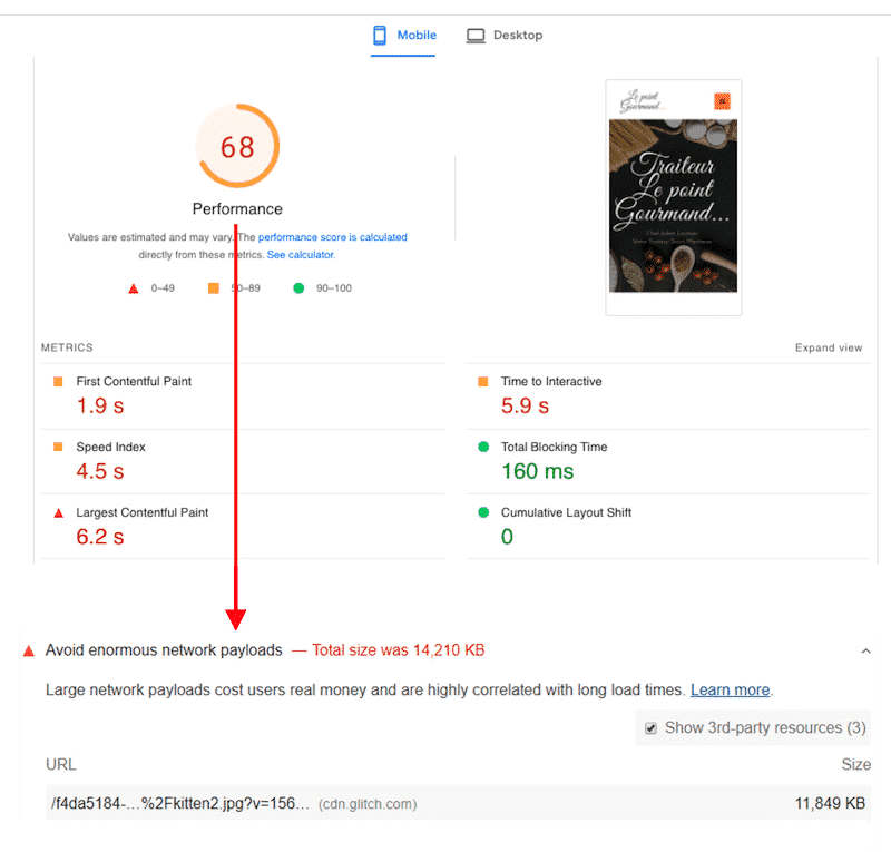 On top of that, I can see that the “Avoid enormous network payloads” warning is triggered with a total size of 14,210K:
